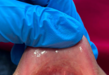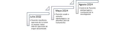 El paciente acude al centro de salud más cercano al lugar de residencia en mayo del presente año. Él mismo reporta la aparición de la lesión en el mes de julio del 2022, la cual empezó como una pequeña lesión que creció poco a poco, comenzó a molestar al momento de la alimentación y generó hábitos parafuncionales. Por lo cual, se indica al paciente la extirpación total de la lesión como tratamiento.