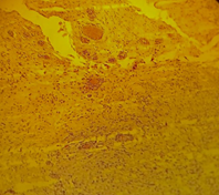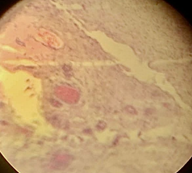 Se realizo biopsia excisional, la misma que muestra hallazgos macroscópicos: Fragmento irregular de tejido blando de 0.9 x 0.5 cm, presencia de una lesión nodular delimitada al corte es de aspecto quístico. (Fig. 2)