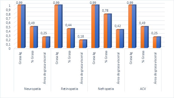 La investigación permitió el estudio de las complicaciones micro y macrovasculares en pacientes con diabetes mellitus tipo 2, destacando su prevalencia en el sexo femenino por componente porcentajes de grasa corporal significativamente mayor frente al sexo masculino; la pertinencia del uso de bioimpedancia respecto a la cuantificación precisa de porcentaje de grasa, y grasa en kilogramos facilita el diagnóstico de composición corporal en este grupo de pacientes. El análisis de la complicación macrovascular (ACV), se encontró una correlación significativa entre la cantidad de grasa en kilogramos y la presencia de complicaciones, los componentes área de grasa visceral y porcentaje de grasa resultan factores que influyen con menos impacto. En cuanto a las complicaciones microvasculares como: la neuropatia, nefropatía, retinopatía; la correlación con el componente de grasa en kilogramos es potencialmente alta, posicionándose como un indicador clave ante el riesgo de complicaciones; mientras que los indicadores área de grasa visceral y porcentaje tuvieron una influencia menor. Estos resultados enfatizan la necesidad de controlar la masa grasa para reducir el riesgo de complicaciones macro y microvasculares en pacientes con diabetes mellitus tipo 2. Este análisis muestra la importancia de la distribución de la grasa, más allá de la cantidad total de grasa corporal, para entender mejor la relación con diversas complicaciones. Los componentes principales han permitido resaltar la relevancia de la grasa visceral específicamente, que parece ser un factor diferenciador clave entre las distintas condiciones patológicas presentadas.