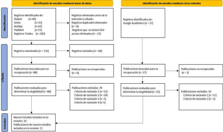 Como ya se mencionó anteriormente el proceso de selección de estudios siguió un proceso sistemático riguroso que permitió identificar las investigaciones más relevantes para cumplir con los objetivos de esta revisión, a continuación se presenta el diagrama de flujo [Figura 1] en el cual se visualiza este proceso. En el diagrama de flujo se puede observar que se identificaron los registros de dos formas distintas, la primera en bases de datos y la segunda de forma manual, en el motor de búsqueda Google Académico. Inicialmente las bases de datos arrojaron un total de 187 artículos, Dialnet 49, Scielo 25, Redalyc 62 y PubMed 51, mientras que de forma manual se encontraron 27 investigaciones, lo que dio un total de 214 estudios. De estos, fueron eliminados 31 trabajos, 8 por estar duplicados y 28 por no tener acceso. Después en un segundo barrido se excluyeron 68 investigaciones, las cuales no estaban relacionados con la temática de estudio. Posteriormente se eliminaron 2 trabajos que en la primera revisión si tenían acceso, pero en una segunda búsqueda, no se los pudo recuperar, finalmente se aplicaron los criterios de elegibilidad para cada artículo, dando como resultado que 63 estudios quedaran eliminados por los criterios de exclusión, quedando así un total de 21 registros incluidos para su revisión a profundidad. De estos 21 estudios se extrajo los datos relevantes mencionados en la metodología los cuales se presentan en la Tabla 3.